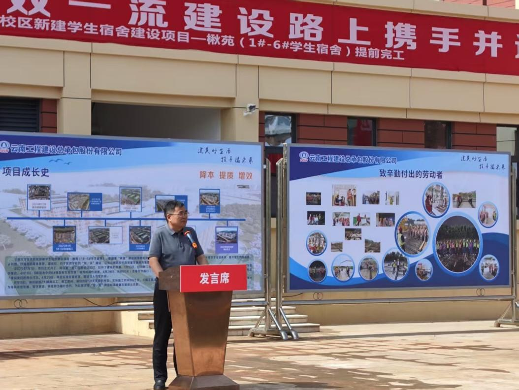副校长陈克清对项目建设成果给予高度评价:“楸苑学生宿舍项目的提前完工,充分体现了各参建单位高度的责任感和专业水平,为学校‘双一流’建设提供了重要的基础设施保障。这是我校改善办学条件、提升育人环境的重要成果。”陈副校长指出:“该项目的建成,不仅为学生提供了更优越、更温馨的生活环境,更对引领云南高校基础设施提质升级与高质量发展具有重要的示范意义。”
